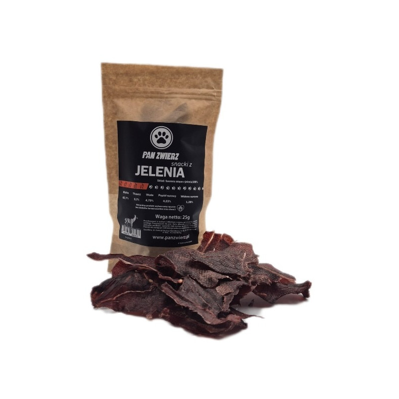 Pan Zwierz Jeleń 25 g suszone smaczki dla psa i kota to monobiałkowy, w 100% naturalny przysmak stworzony z myślą o zwierzętach wrażliwych, alergikach oraz pupilach żywionych dietą eliminacyjną i BARF. Produkt zawiera wyłącznie czyste, suszone mięso jelenia, pochodzące od zwierzyny żyjącej w naturalnych warunkach, co gwarantuje wysoką jakość białka oraz brak sztucznych dodatków, konserwantów i wypełniaczy.