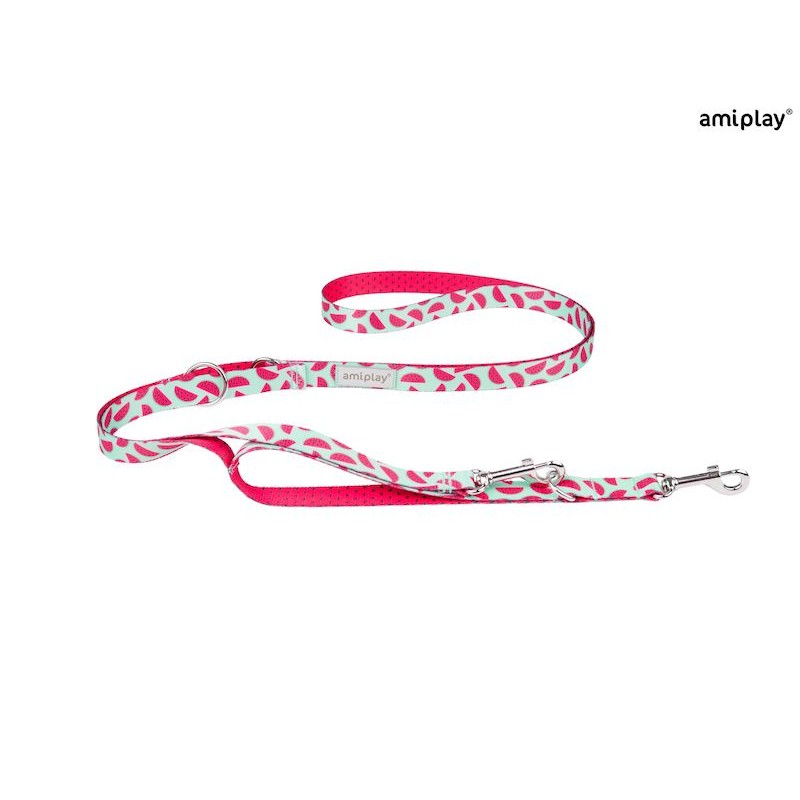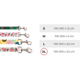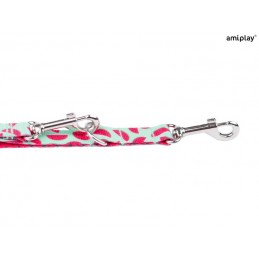 Smycz wykonana jest z wytrzymałej taśmy, odpornej na warunki atmosferyczne o niezwykle radosnej kolorystyce. Zastosowana taśma jest bardzo łatwa w czyszczeniu, wystarczy przetrzeć ją wilgotną szmatką lub wyprać, gdy zajdzie taka potrzeba i znów jest gotowa do użycia. Wygodna rękojeść zapewnia dużą pewność prowadzenia psa. Przy uchwycie znajduje się oczko służące do wygodnego przypięcia pojemnika na woreczki.