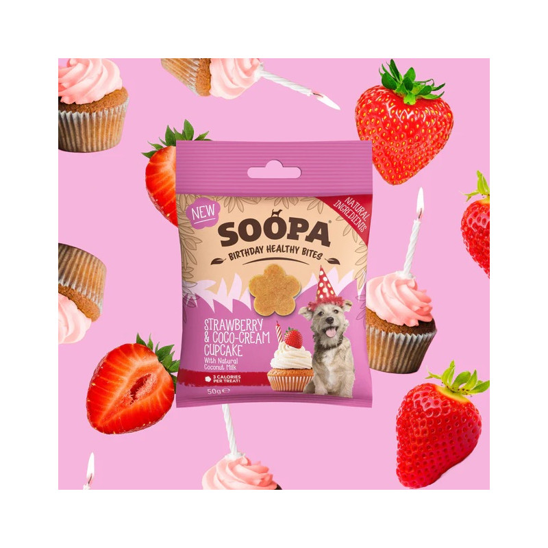 Soopa Healthy Bites Truskawka i Kokos 50 g to lekkie, naturalne i hipoalergiczne smakołyki stworzone z myślą o psach, które uwielbiają żuć, a jednocześnie potrzebują zdrowych, bezzbożowych przekąsek. Każdy kąsek ma jedynie 3 kcal, dzięki czemu stanowi idealną nagrodę podczas treningu lub codziennych aktywności.