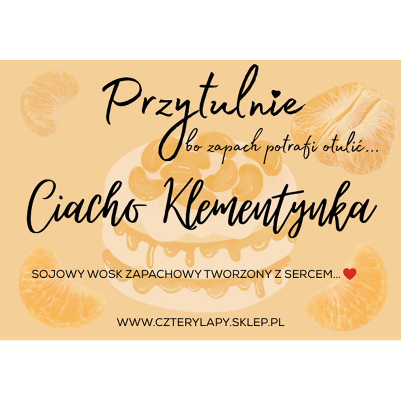 Przytulnie Ciacho Klementynka – sojowy wosk zapachowy ŁAPKA to aromatyczna propozycja, która wypełnia wnętrze ciepłem, słodyczą i nutą świątecznej beztroski. Produkt jest wykonany z naturalnego wosku sojowego, dzięki czemu topi się równomiernie, długo utrzymuje zapach i jest bezpieczny dla domowych pupili oraz całej rodziny. Wygodna forma łapki sprawia, że korzystanie z wosku jest proste i estetyczne, a intensywna kompozycja zapachowa wprowadza do mieszkania przytulną, deserową atmosferę.