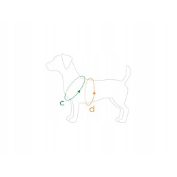 Aby dobrać właściwy rozmiar, zmierz obwód szyi psa (nad łopatkami) – pomiar C, a także obwód klatki piersiowej w najszerszym miejscu – pomiar D, jak na rysunku poniżej. Następnie porównaj pomiary z tabelą rozmiarów. Niektóre rozmiary pokrywają się – w takim wypadku zdecyduj na podstawie szerokości przedniego zabudowanego panelu. Weź pod uwagę wielkość psa, a także jego temperament.
