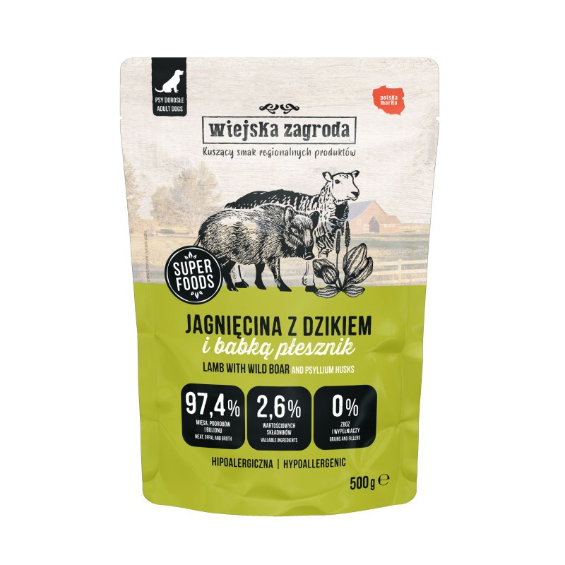 Wiejska Zagroda karma mokra dla psa Jagnięcina z dzikiem i babką płesznik 500 g to połączenie wysokiej jakości mięsa, naturalnych dodatków i wyjątkowego smaku, który pokocha Twój pies. Postaw na sprawdzoną jakość i wybierz Wiejską Zagrodę – bo zdrowie pupila zaczyna się od miski!
